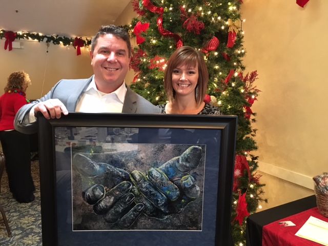 Real Estate Broker, Annie Logan of Cressy & Everett Real Estate stands proud next to her original painting she donated for the auction event. The buyer, Nick Wyse, Real Estate Broker with ReMax Results said "I would've paid alot more...I absolutely love it."